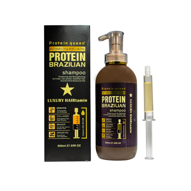 شامپو مو پروتئین کوئین مدل luxury hairtamin حاوی کراتین و ویتامین B5 و فرمول تغذیه کننده ای است که می تواند موها را تمیز کند، فولیکول های مو و ریشه مو را مرطوب کرده و در عین حال نرمی مو را افزایش می دهد . شامپو پروتئین برزیلی protein queen برای موهای رنگ شده، کراتین شده و آسیب دیده بسیار مناسب می باشد. فرمولاسیون این محصول چربی پوست سر و مو را متعادل می کند.در فرمولاسیون این شامپو از پروتئین برزیلی، کراتین، آرگان خالص، کلاژن و زنجبیل استفاده شده است. این ترکیبات بی نظیر به اح ...
